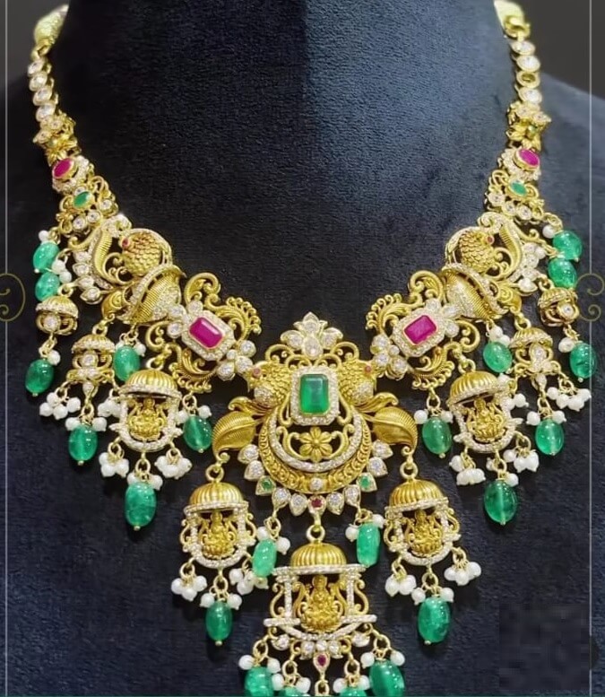 SriVenkatrama Jewellers @09392312478Presenting a beautiful traditional 22k gold necklace which is adorned with precious stones and emeralds and kempu. the necklace design was well crafted with peacock and floral pattern all over the necklace and the impression of goddess Lakshmi devi sitting in lotus flower under the umbrellas with hanging pearls and beads give a unique look and eye-catching. the pendant in the center of the necklace is well-designed in a floral pattern