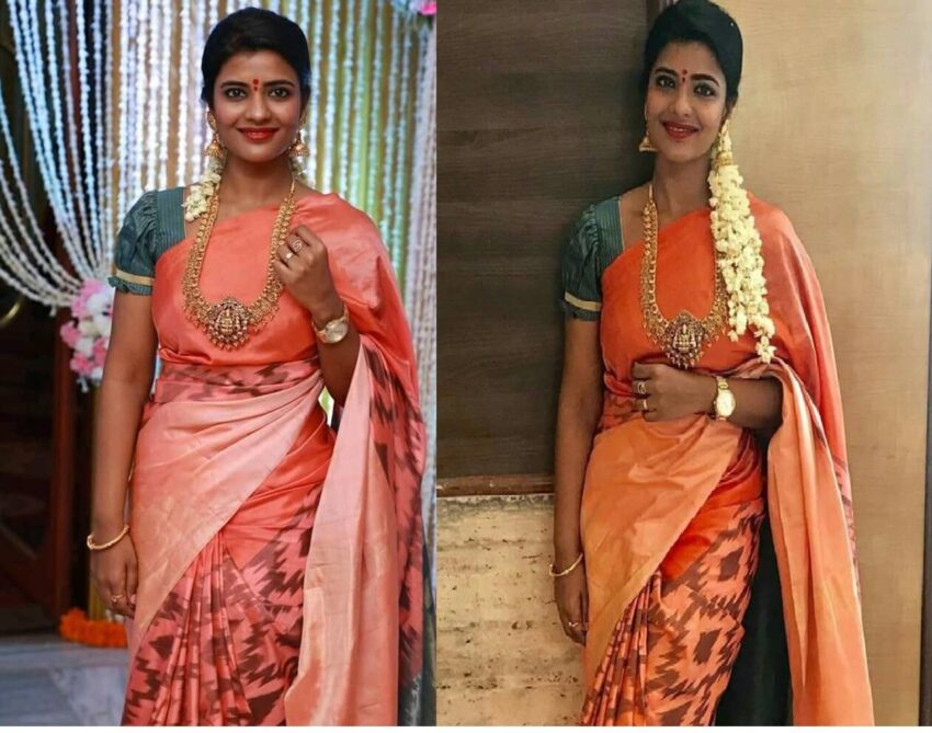 Aishwarya Rajesh  has a special reputation not only in her own country but all over the world. she adorn herself with traditional attire along with traditional jewellery. The long haram worn by her is of nashi desing which was customized with mango and peacock design .  This 22k gold haram is very unique with lakshmi devi pendant in the centre paired with matching earrings.