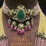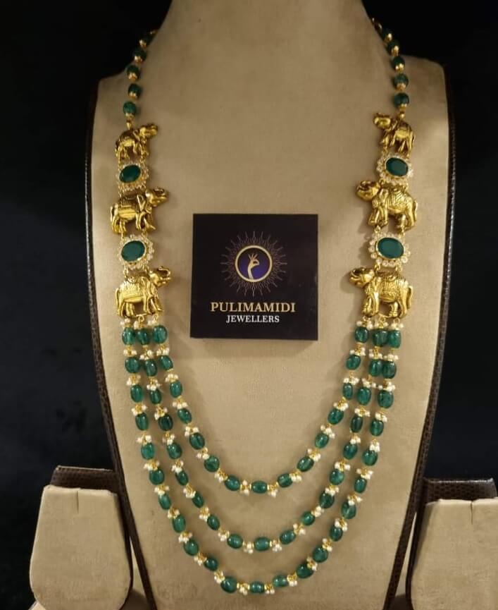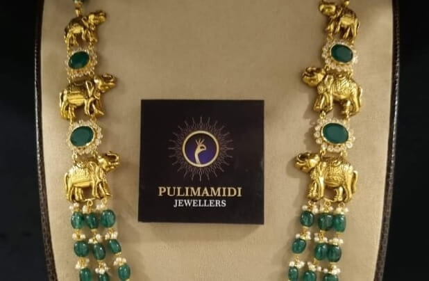 This new document is about a particular piece of jewelry – a gold haram with emerald beads and an elephant side pendant. It is of an exquisite design, crafted with consideration and care by expert jewelers. The haram is made of solid gold, which is highly durable and has a timeless beauty. The emerald beads are carefully arranged in the traditional style, making the piece truly unique. Buy this from pulimamidi Jewellers@098853 19029