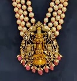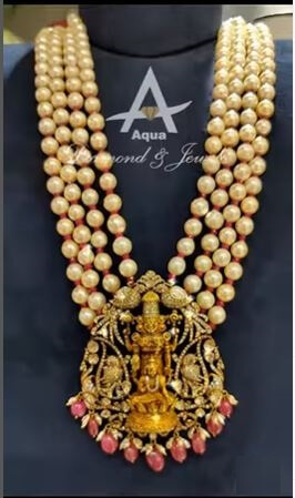 Necklace made by Aqua Diamond & Jewels that features pendants of Lakshmi Devi and Balaji, which are Hindu deities, and is made of 22-karat gold. The necklace also has multiple strands or layers of pearls.A “long haram” is a type of necklace that is typically made up of multiple strands or layers. The pendants may be made of precious diamonds and hanging pearls and rubies. shop this from Aqua diamond & Jewels.