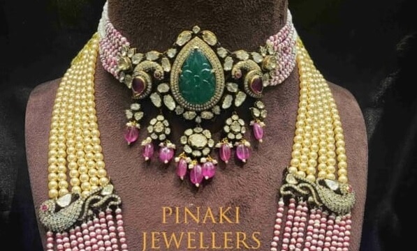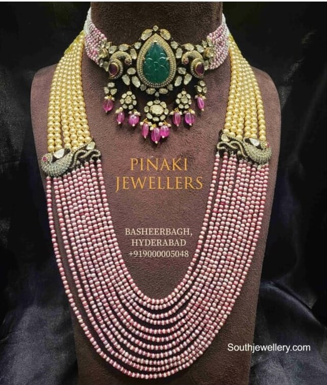 Introducing the perfect set of jewellery for this festive season – a beautiful beaded choker with a peacock polki pendant and a layered beads haram with peacock side pendants. This exquisite combination is sure to add a regal and elegant touch to your look. Crafted with careful detail and precision, each piece is unique and special. The gold-plated brass material gives the jewellery a timeless charm that will last for ages. buy this from Pinaki Jewellers @ 90000 05048