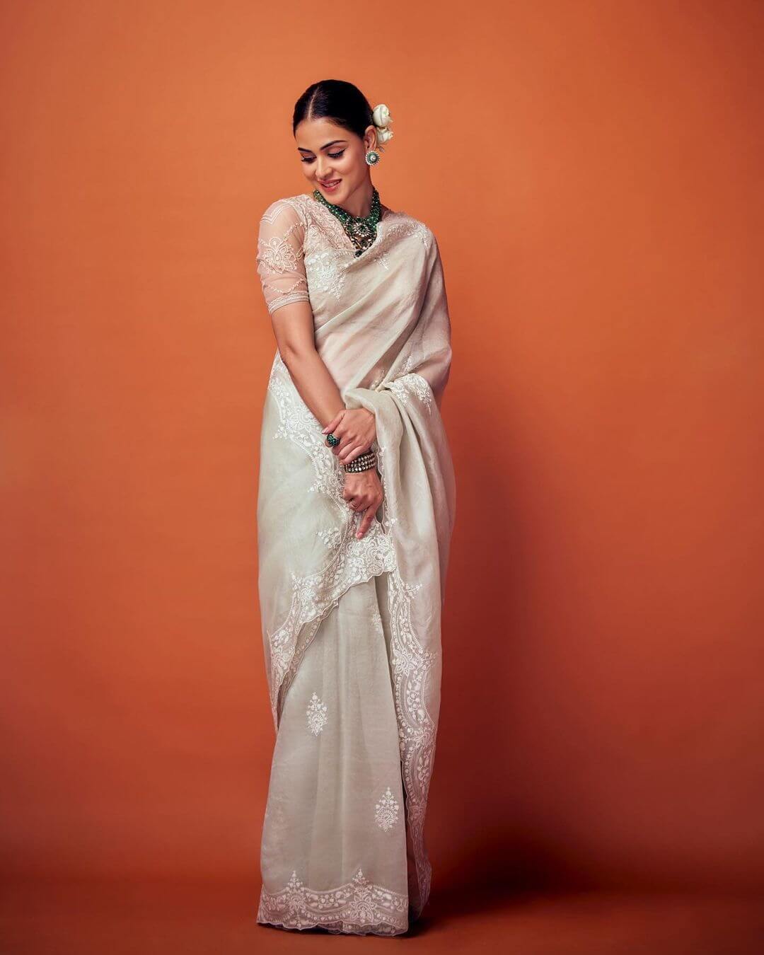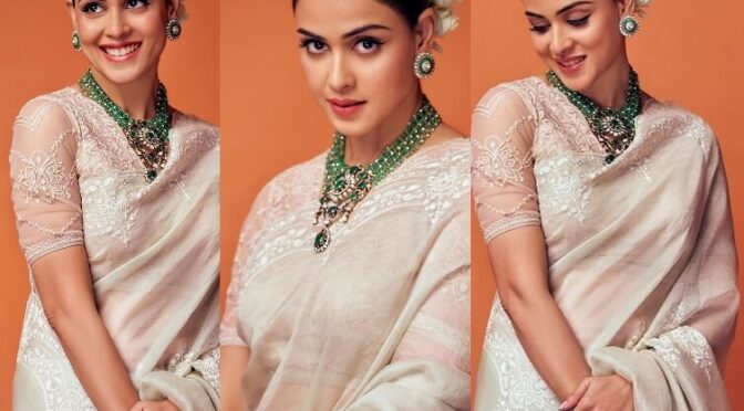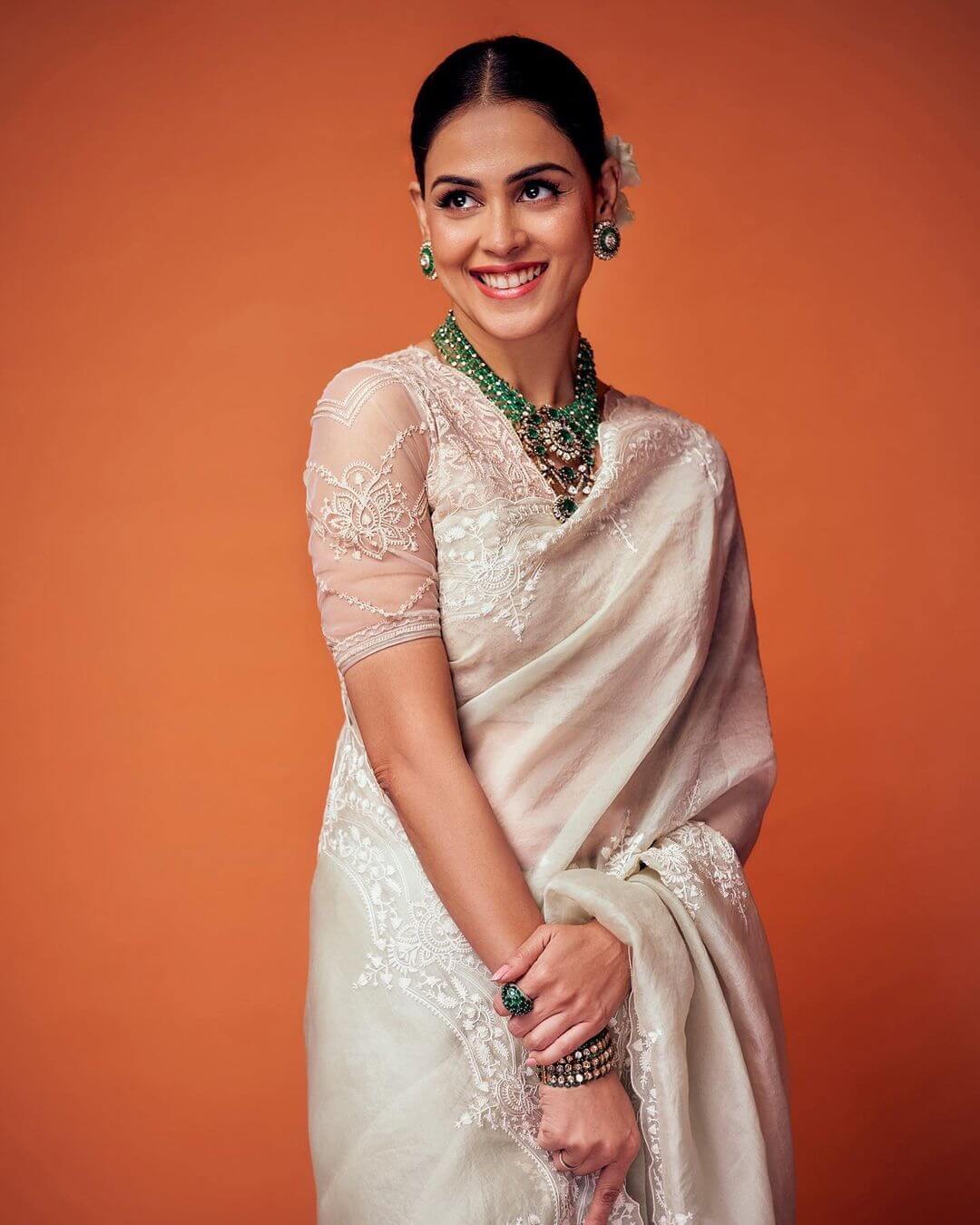 Jenelia  Deshmukh was captured on camera during a photo shoot and she is looking very pretty in traditional attire. She seems to have a good sense of style in choosing her outfit and jewelry. The necklace that she is wearing was designed by Goenka India, and it is described as well-designed with precious beads. The pendant in the center of the necklace is mentioned as more attractive and it likely adds a beautiful focal point to the necklace. The necklace likely compliments her traditional attire and overall look.