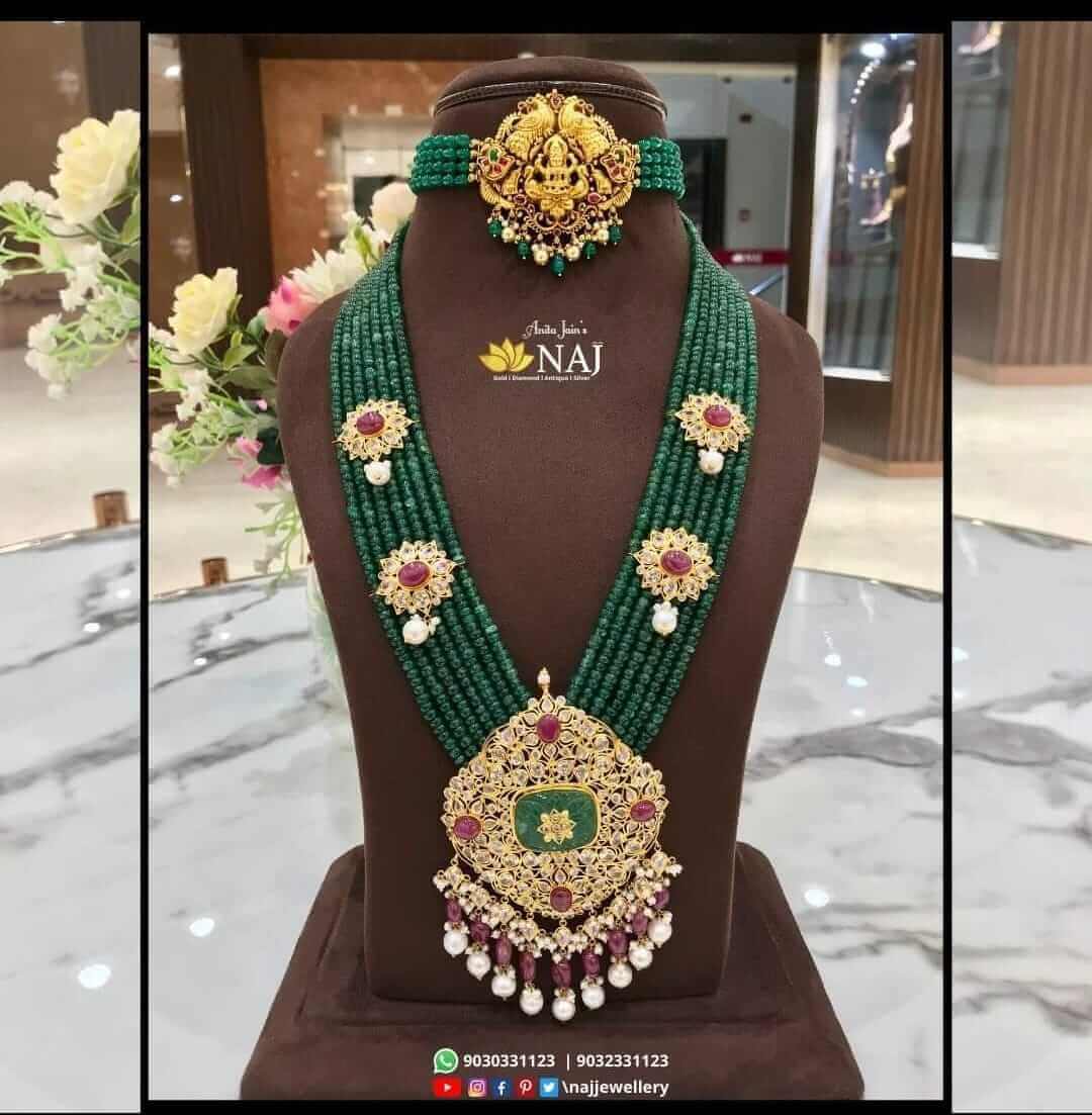 This 22 carats emerald beads long haram with side pendant and this unique pendant having…