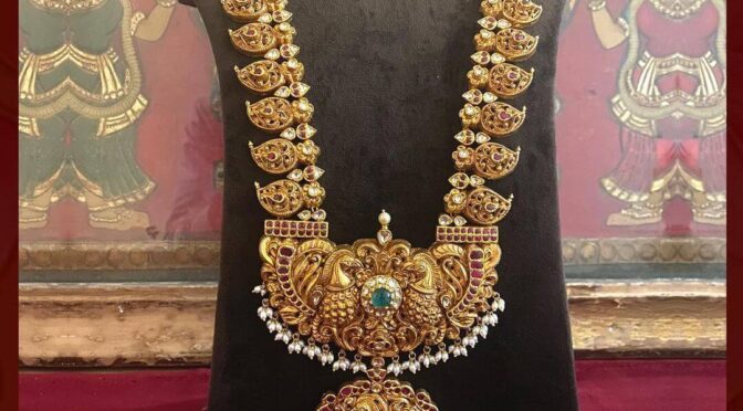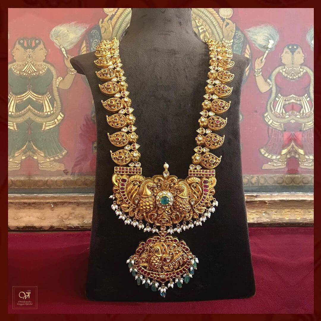 It is becoming more and more popular to wear heavy bridal necklaces these days. Putting this statement necklace on a traditional saree is just the right thing to do. A 22 carat gold antique mango haram with rubies, emeralds, sapphires and clear cutting stones that is centered with an antique locket with a peacock motif is adorned with rubies, emeralds, sapphires and clear cutting stones. shop this beautiful long haram from H. Vithaldas Jewellers.@9391077403