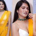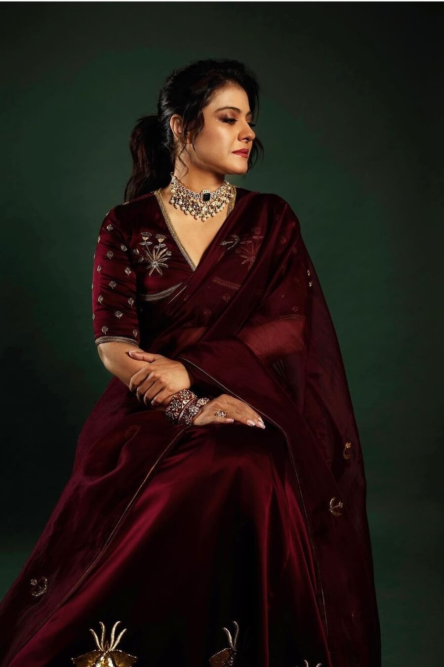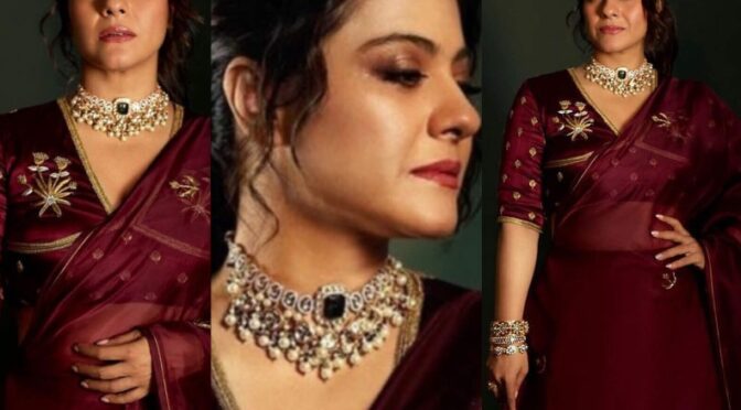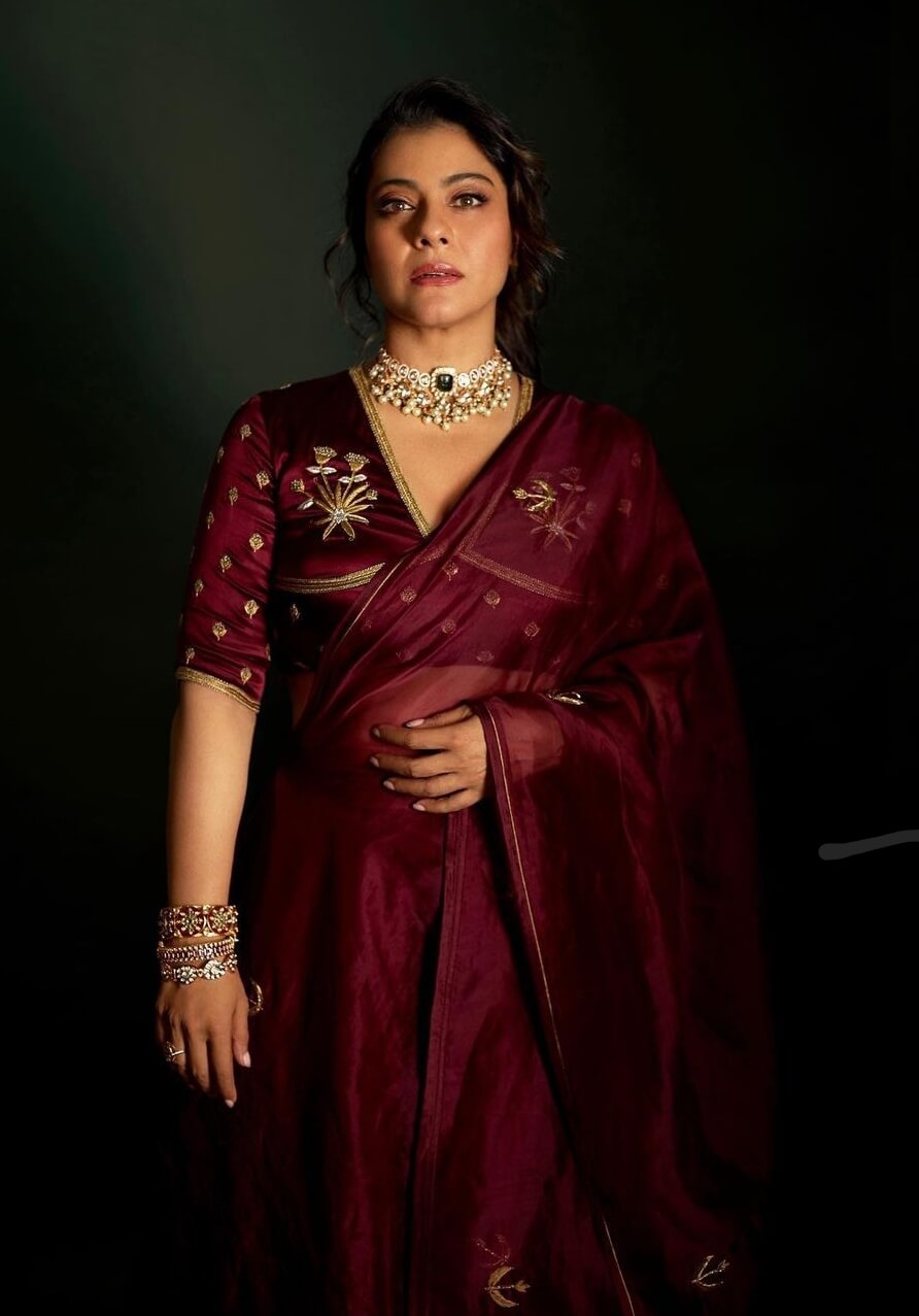 Actress Kajol Devgan and Vishal Jethwa, the actors of the upcoming movie, “Sa Re Ga Ma Pa”, attended the film City’s sets in Bangalore on Wednesday. She sported a saree in maroon colour, an emerald studded choker and a set of bangles by Curio cottage.