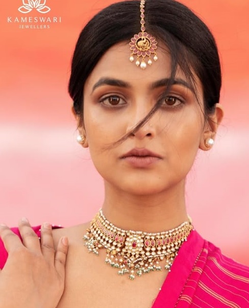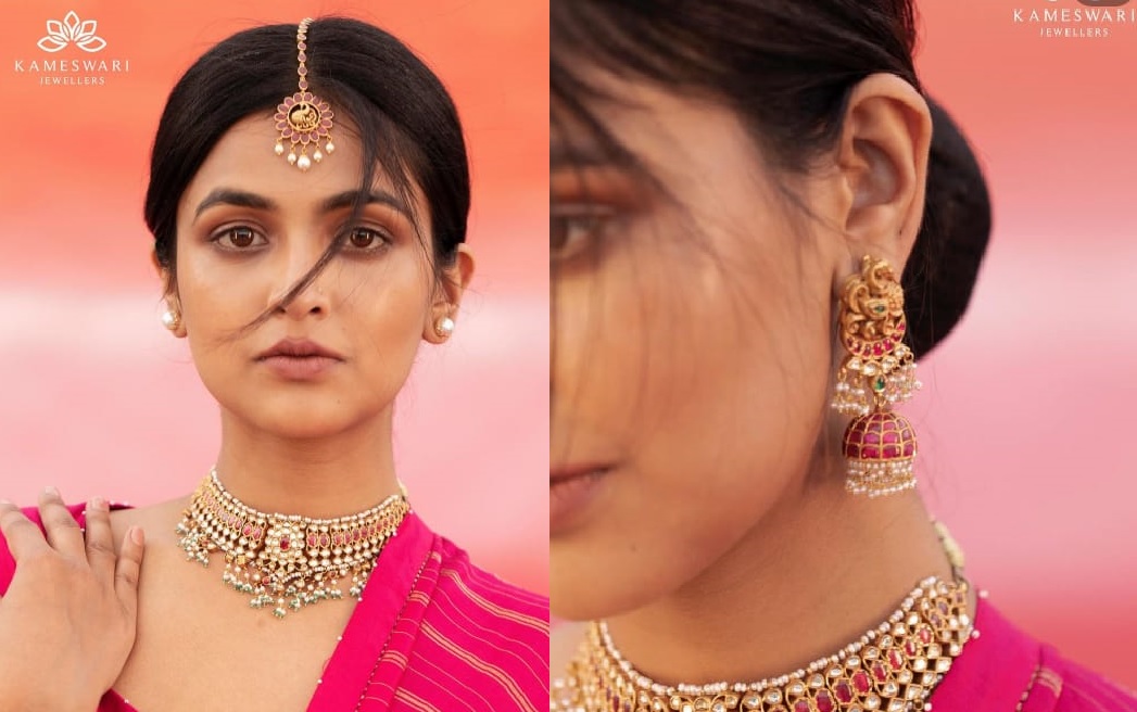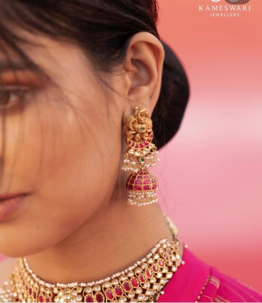 Kundan choker with bunch of pearls. Kundan jewellery collection that celebrates every woman and her relationship with Jewellery. Intricately crafted kundan choker and Maan Tika and Jhumkis are perfect for bridal collection. This Kudan choker was adorn with precious kundans all over the neckline and the center pendant was well designed in floral pattern and the pink color kundan in the middle is more eye catching. Maang Tika is traditionally crafted with peacock design in the center and the hanging pearls gives elegant look to your forehead and the matching Jumkis with peacock design and hanging pearls are more beautiful buy this kundan Jewellery from Kameshwari Jewellers @7842802888