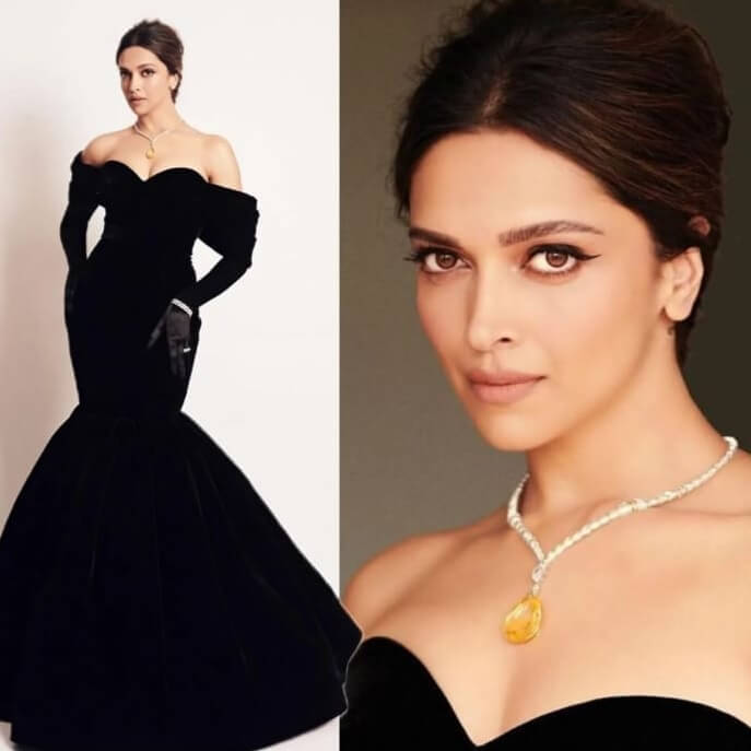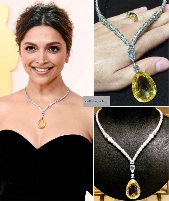 Cartier is a highly respected and prestigious jewellery brand and a yellow sapphire necklace from their collection would undoubtedly be a statement piece that could enhance any outfit. pairing a designer outfit with a statement necklace is a common trend on the red carpet. and its likely that Deepika padukone appearance at the Oscars was highly anticipated and well received by fans and fashion critics alike.