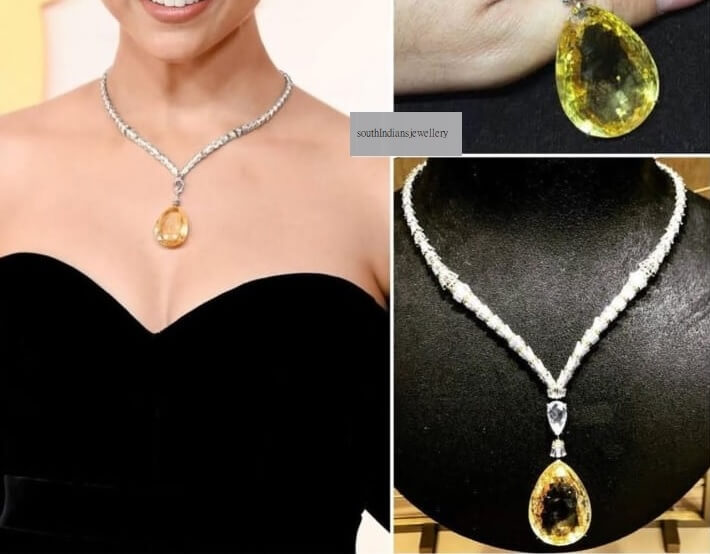 Cartier is a highly respected and prestigious jewellery brand and a yellow sapphire necklace from their collection would undoubtedly be a statement piece that could enhance any outfit. pairing a designer outfit with a statement necklace is a common trend on the red carpet. and its likely that Deepika padukone appearance at the Oscars was highly anticipated and well received by fans and fashion critics alike.