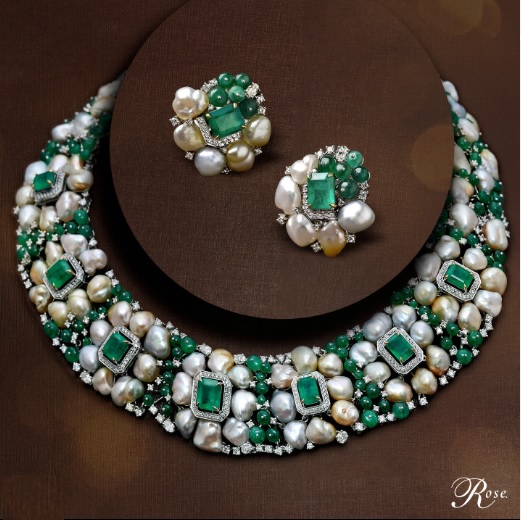 The collar necklace is bold and elegant set of jewelry. The combination of brilliant-cut diamonds, multi-hued keshi pearls, and green emeralds would create a visually striking and unique design. Keshi pearls are a type of pearl that are small and often irregular in shape, with a smooth, satiny surface. They are formed when the pearl sac inside an oyster becomes filled with nacre, the iridescent substance that gives pearls their luster. Keshi pearls are known for their unique and natural appearance, and are often used in jewelry designs to add a rustic, organic touch. The addition of diamonds and emeralds would add sparkle and depth to the set, creating a statement piece that is both vivid and elegant. shop this elegant necklace from thehouseofrose jewels