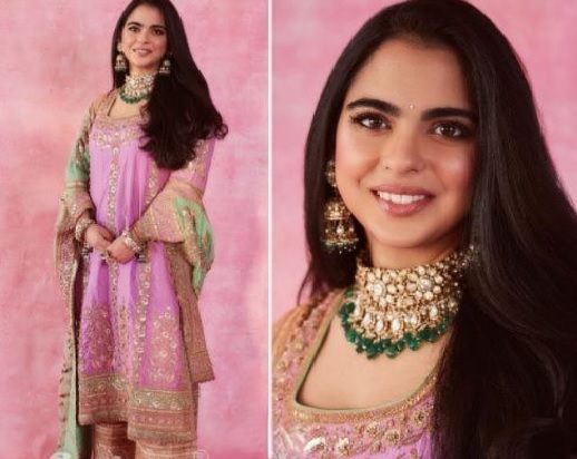 Mukesh Ambani’s daughter Isha Ambani so pretty in polki diamond necklace at her brother Anant Ambani’s mehndi.