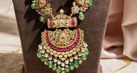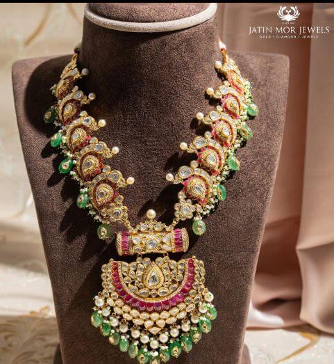 In the form of an etching, this polki Haram set promises eternal love with ruby red gemstone motifs along its length. It also has natural emerald drops that inspire admiration around the world.