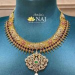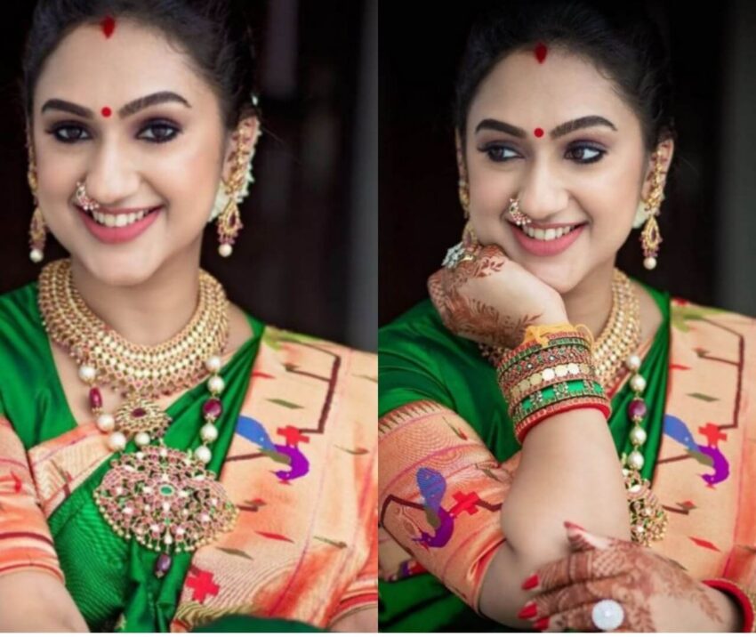 Charming Pritha Hari wore 22k Gold kundan necklace . This unique necklace studded with kundans and precious stones and floral pattern. The small ruby beads gives more elegant look to the necklace. the earrings also studded with rubies and hanging pearls, she also wearing the traditional nose pin which gives more elegant look and the matching bangles makes are look unique and classy.