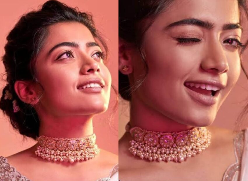 The gorgeous acctress Rashmika Mandanna ,the winner of the ‘Bangalore Times 30 Most Desirable women of 2017’ and alos been called, ‘Pan-India Actress’. She enjoys a huge fanbase across the nation and has been bestowed with the title, ‘National Crush of India’. she adron herself with kundan choker. this Choker is studded with precious kundans and hanging small and big pearls as bunches. The choker is cutomised in floral pattern and hanging sea pearls. This choker gives unique look to her paired with simple stud earrings.
