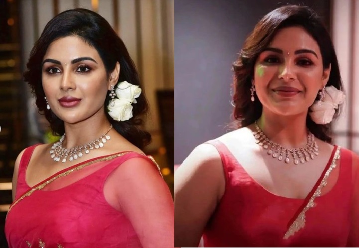 Telugu Actress Samyuktha Menon at SIR (Vaathi) Movie Trailer Launch. She adorn herself in red saree with simple and elegant CZ jewellery . you can customize this beautiful jewellery with diamonds. The necklace is well designed in floral pattern. overall she is looking pretty in traditional wear.