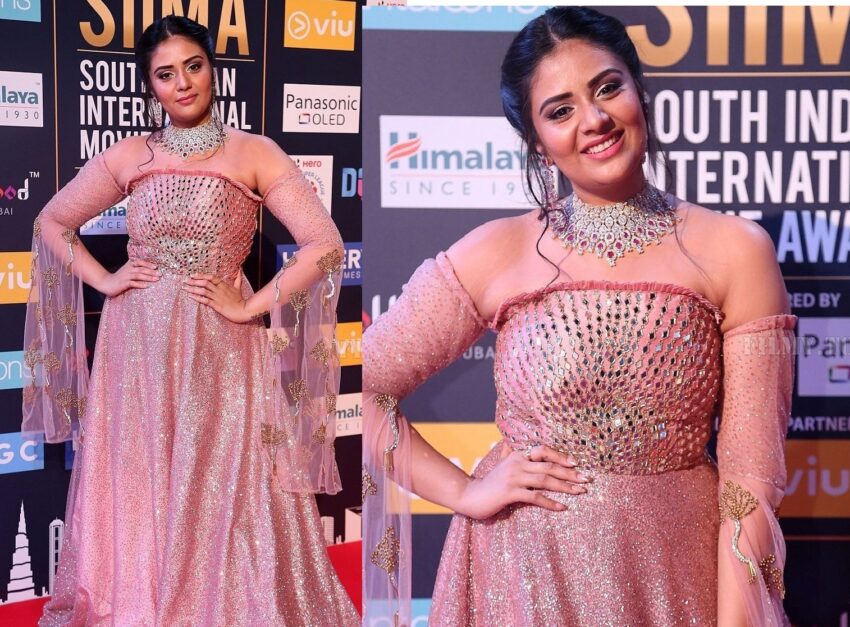 Sreemukhi in looking Gorgeous at Siima film Event. She adorn herself with diamond necklace. This beautiful diamond necklace was well crafted with precious diamonds in floral pattern.A diamond journey necklace is a personal piece of jewelry that can symbolize a journey through life and love. It is a great way to celebrate a major milestone such as a celebration event or anniversary.
