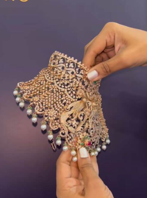 This Diamond choker is a true master piece expertly studded with precious diamonds that catch the light and add a touch of luxury to your look. the intricate peacock design and floral pattern are stunningly crafted, highlighting the emeralds and hanging south sea pearls that add an extra touch of elegance