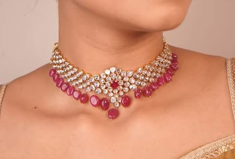 Necklace that was recently launched by Karan Johar from Tyaani Jewelers, but it sounds like it would be a beautiful piece of jewelry featuring Polki diamonds and precious ruby. Wearing it over the neck would give an elegant look, and it could be worn on traditional attire. tyaanijewellery