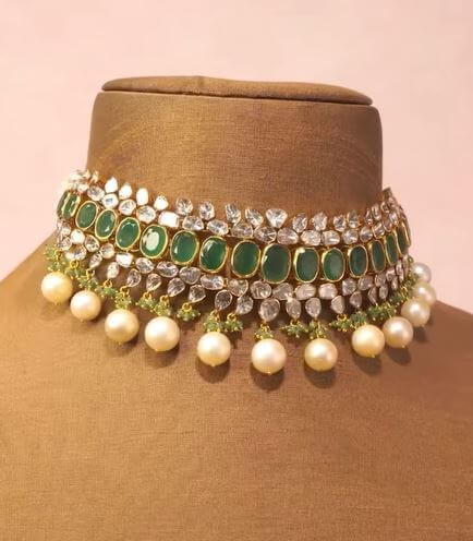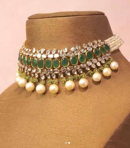 This 22k gold Garima choker that is designed for weddings. The choker is crafted with Zambian emeralds, south sea pearls, and natural uncut diamonds, which may make it a luxurious and high-end piece. It is currently available at a store in Hyderabad, India. If you are interested in purchasing this choker, you may want to visit the store in person to see it in person and try it on. You can also contact the store to ask about purchasing options if you are unable to visit in person. reach out to Tyaani jewels @93918 44139.