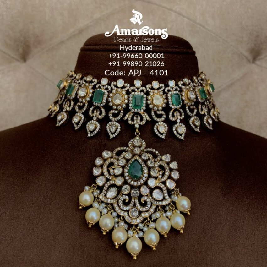 In recent years, victorian style diamond necklaces have become one of the most popular bridal jewelry items. Look at the below beautiful 18 carat gold necklace in Victorian style adorned with diamonds and emeralds with a final touch up with south sea pearls by amarson jewellers